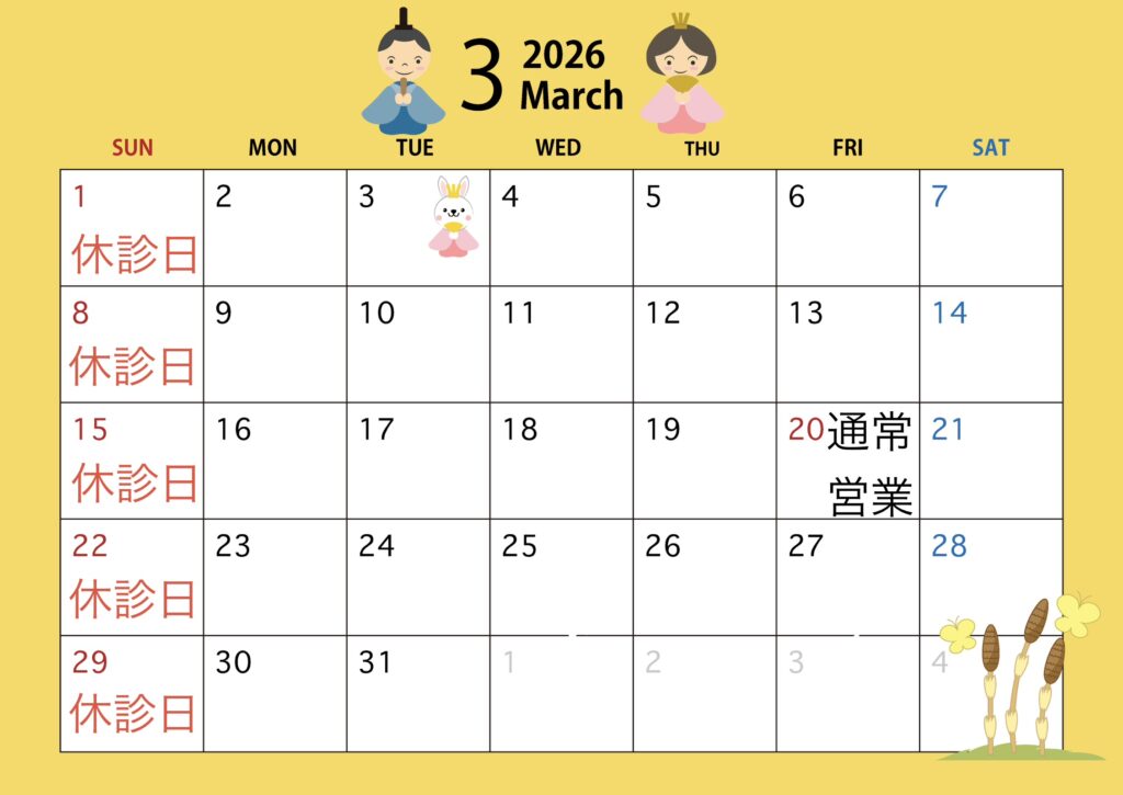 当院では、日曜日が休診日になりますが、20(祝金)「春分の日」も通常営業になります。WEB予約をご確認の上ご来院下さい。