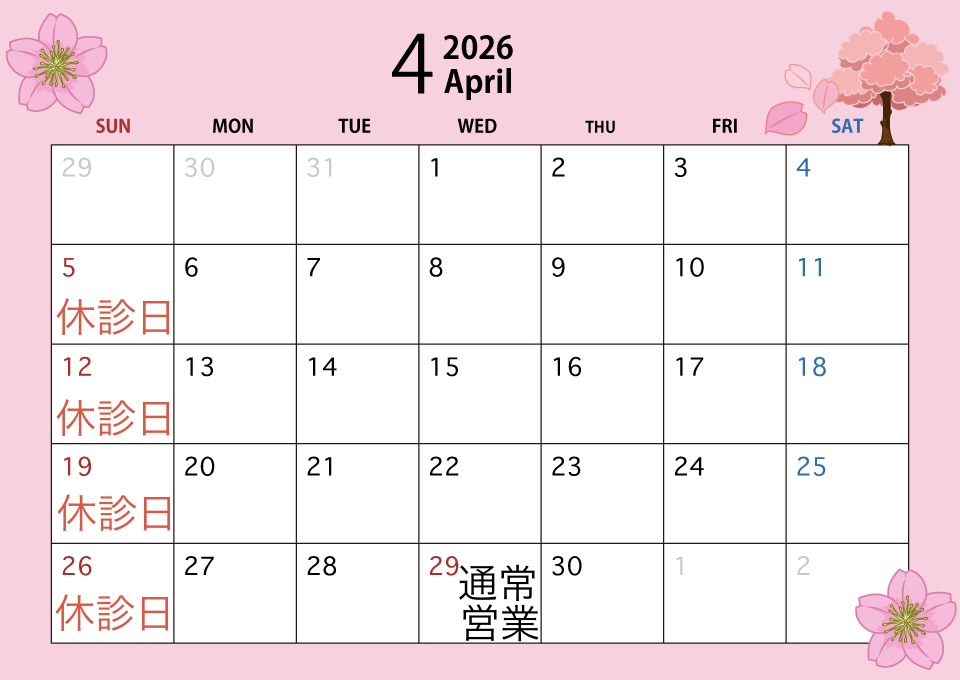 当院では、日曜日が休診日になりますが、29(祝水)「昭和の日」も通常営業になります。WEB予約をご確認の上ご来院下さい。